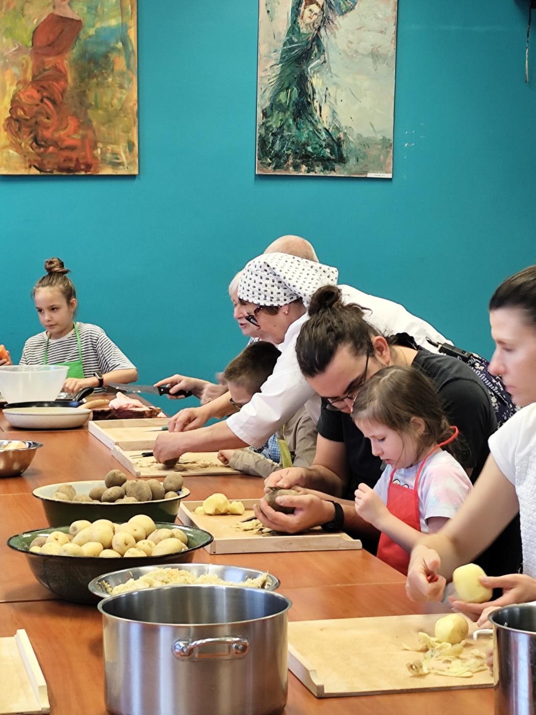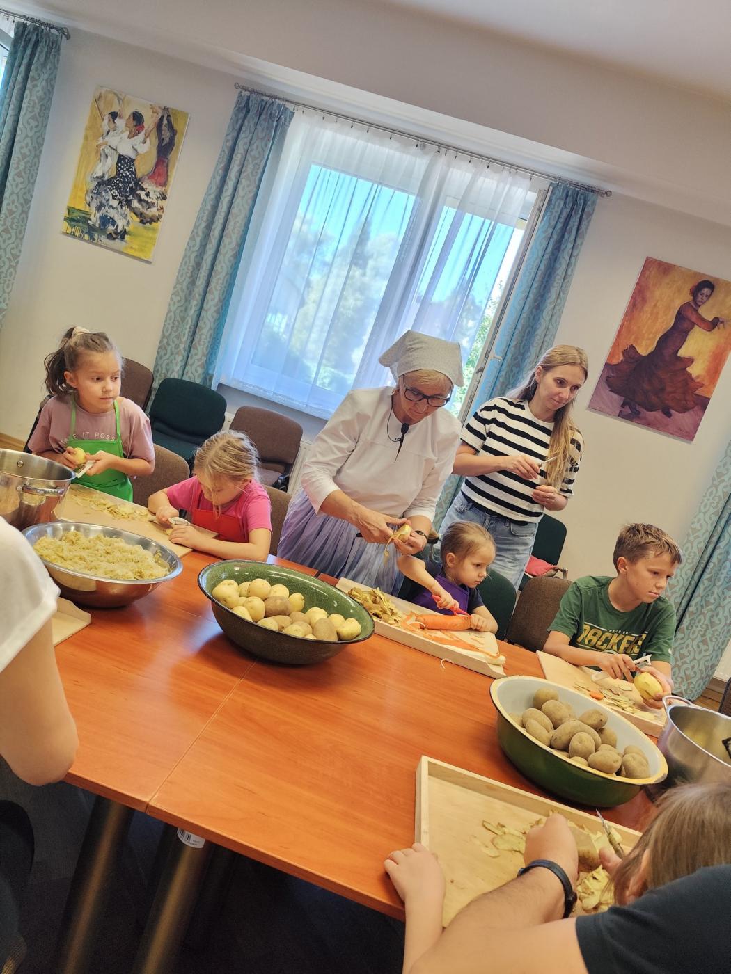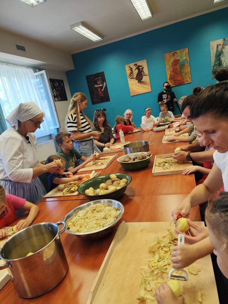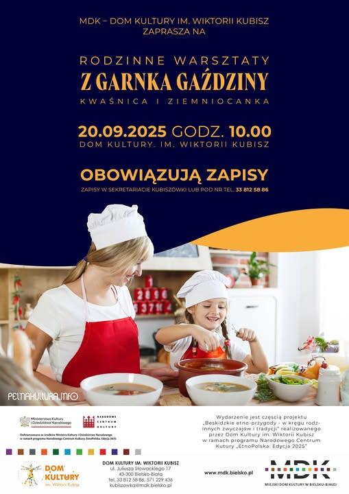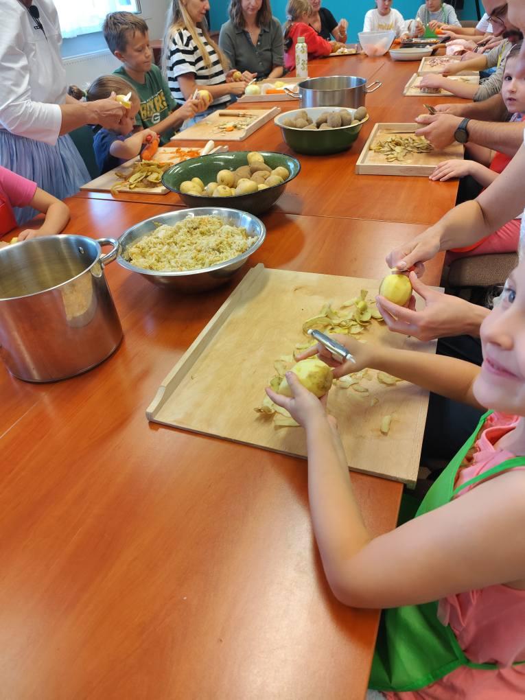 Tak reklamowano te zajęcia kulinarne: Macie ochotę odkryć prawdziwe smaki góralskiej i wiejskiej kuchni? A może chcecie spędzić czas razem w pachnącej, gwarnej i pełnej smaku atmosferze? Zapraszamy Was na rodzinne warsztaty kulinarne prowadzone przez gospodynie ze Stowarzyszenia Społeczno Kulturalnego „Grojcowianie”! W programie wspólnie przygotujemy dwa klasyczne dania: aromatyczną „kwaśnicę” – króla góralskich stołów i rozgrzewającą „ziemniocankę” – prostą, a tak pyszną! Zajęcia odbyły się 20 września (sobota) w Dom Kultury im. Wiktorii Kubisz. Wydarzenie odbyło się w ramach projektu „Beskidzkie etno-przygody” dofinansowanego z programu Narodowego Centrum Kultury „EtnoPolska. Edycja 2025”.