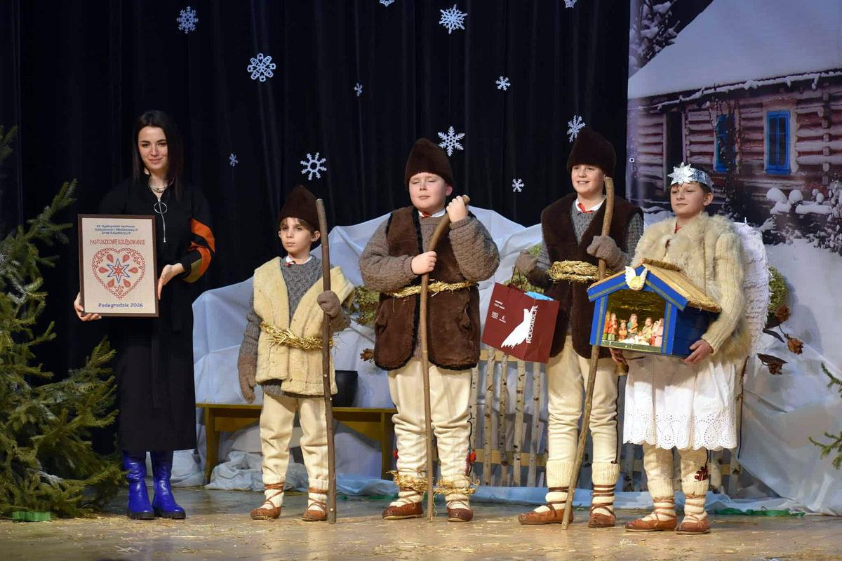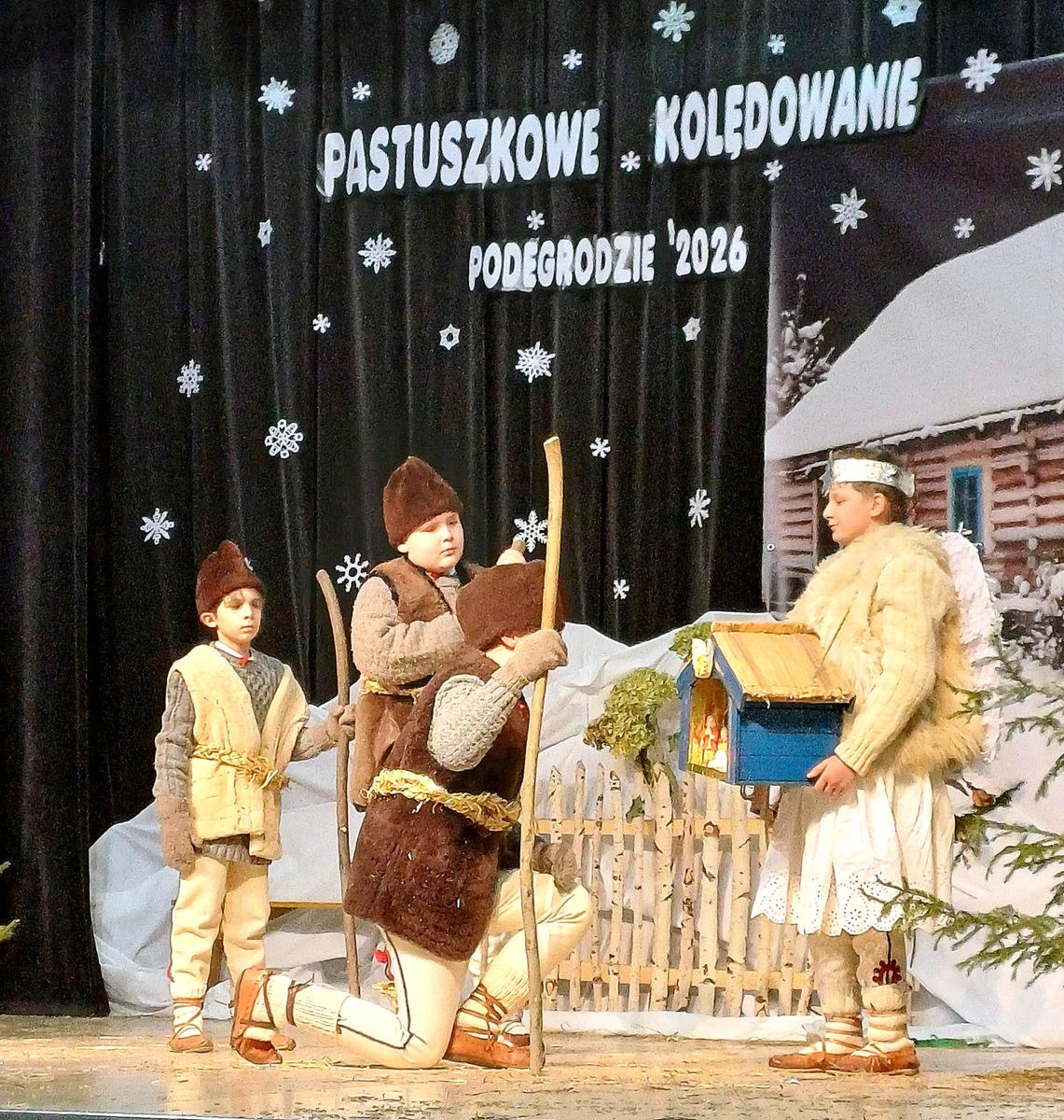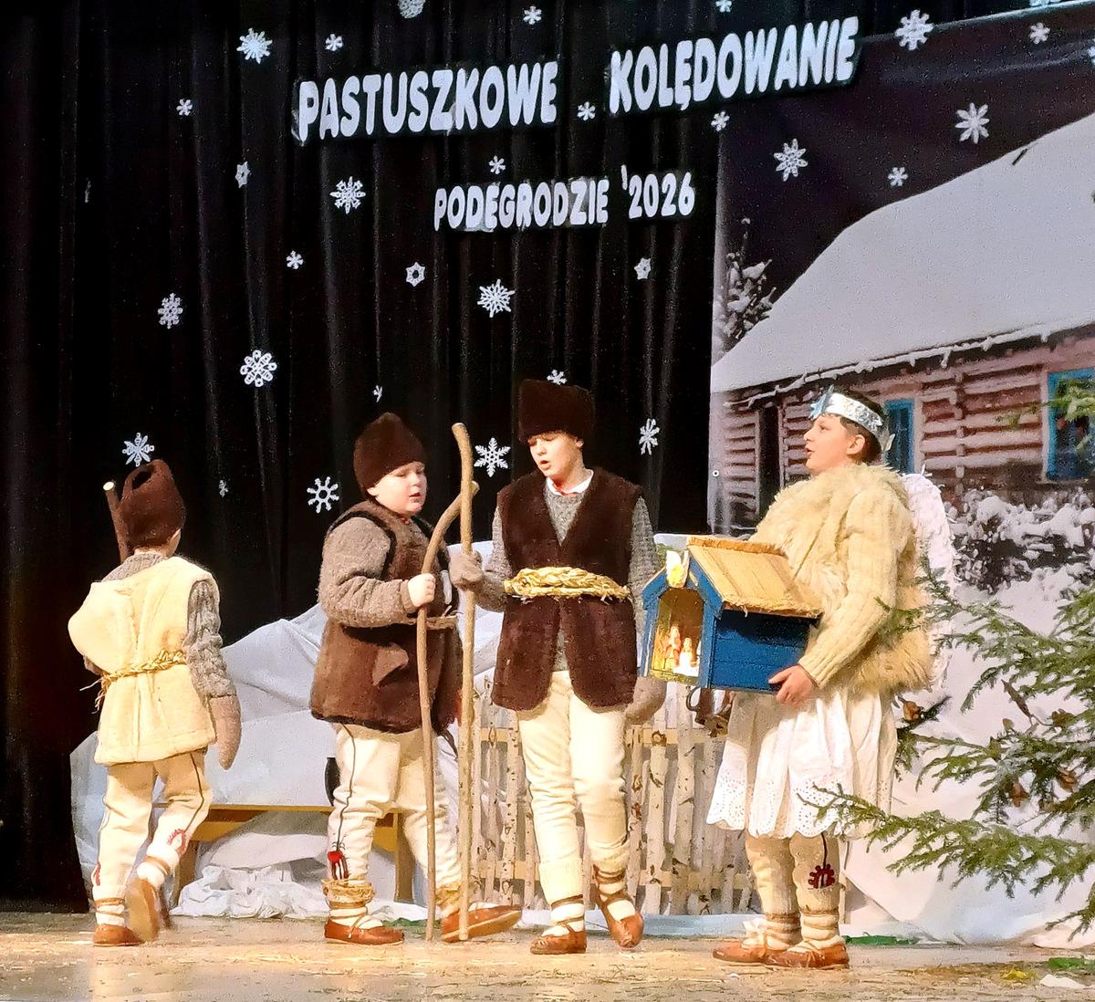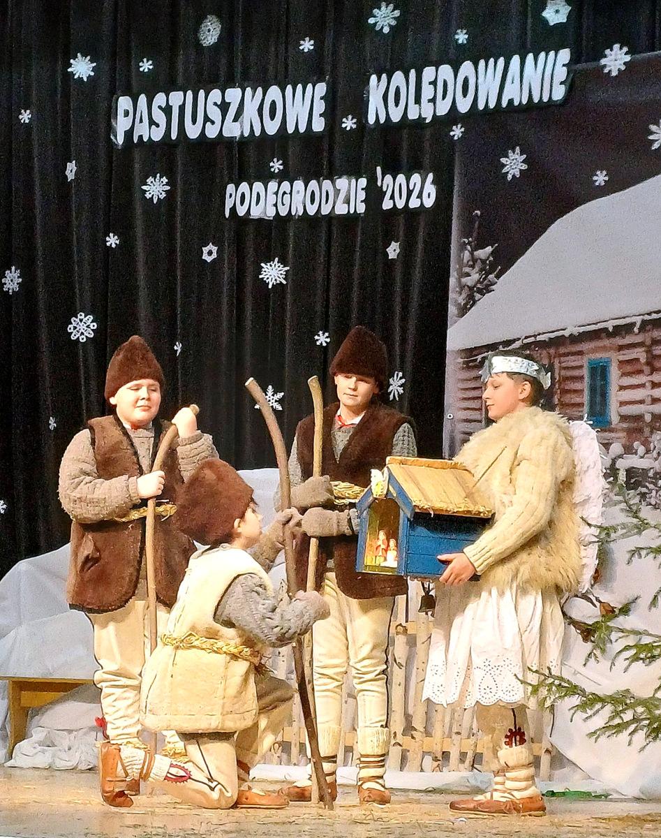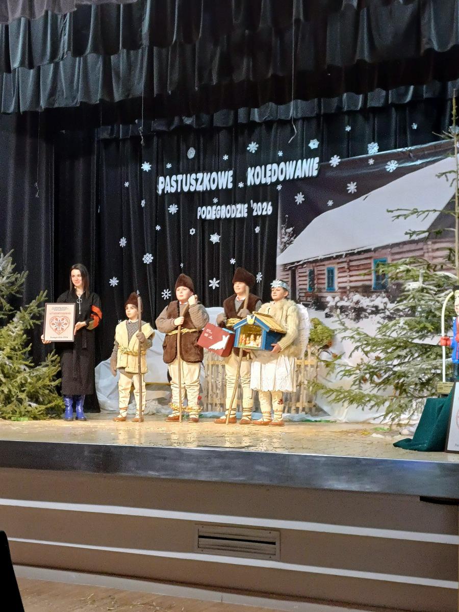 Nasza reprezentacja - Hubert, Wiktor, Tomek i Michał - na scenie Gminnego Ośrodka Kultury w Podegrodziu - na 29. Ogólnopolskich Spotkaniach Dziecięcych i Młodzieżowych Grup Kolędniczych PASTUSZKOWE KOLĘDOWANIE !!! Brawo chłopaki - jesteśmy z Was dumni. Grupa kolędnicza Mali Grojcowianie prezentująca OBCHODZENIE PASTUSZKÓW Z ANIOŁEM zajęła III MIEJSCE podczas 29. Ogólnopolskich Spotkań Dziecięcych i Młodzieżowych Grup Kolędniczych PASTUSZKOWE KOLĘDOWANIE