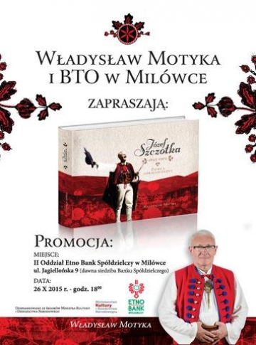 Dnia 26 października 2015 roku, w poniedziałek o 18 w siedzibie Etno Banku Spółdzielczego w Milówce, przy ul. Jagiellońskiej 9, odbędzie się spotkanie promocyjne książki Władysława Motyki "Józef Szczotka (1893-1965) - Piewca góralszczyzny". Książka została wydana dzięki wsparciu Ministerstwa Kultury i Dziedzictwa Narodowego. Realizacja projektu na wydanie publikacji książkowej wraz z płytą audio "Józef Szczotka (1893-1965) - Piewca góralszczyzny" wchodzi w finałowy moment. Projekt o numerze 56938/14/A1 jest realizowany w ramach programu Ministra - Dziedzictwo kulturowe - Kultura ludowa i tradycyjna. Rok 2015 obchodzony jest przez Beskidzkie Towarzystwo Oświatowe jako Rok Józefa Szczotki, ze względu na 50 rocznicę śmierci artysty. Józef Szczotka to ikona Milówki i góralszczyzny. Książka która powstała jest potwierdzeniem tego, że Józef Szczotka to wybitna postać, która zasługuje na utrwalenie w dziedzictwie kulturowym gór, ale także całej Polski. Ministerstwu Kultury i Dziedzictwa Narodowego składamy podziękowanie za dofinansowanie projektu, serdeczne Bóg zapłać! Sponsorami publikacji są także: Etno Bank Spółdzielczy, Golec uOrkiestra, Bank Spółdzielczy w Węgierskiej Górce oraz Nadleśnictwo Ujsoły, którym również składamy serdeczne Bóg zapłać! Wszystkich mieszkańców Milówki i okolic, i wszystkich tych którzy kochają góralszczyznę i kulturę serdecznie zapraszamy na oficjalną premierę książki. Spotkajmy się 26 października 2015 roku, w poniedziałek o 18 w siedzibie Etno Banku Spółdzielczego w Milówce, przy ul. Jagiellońskiej 9. Do zobaczenia!"
