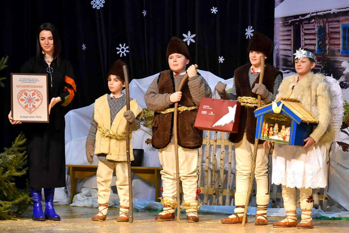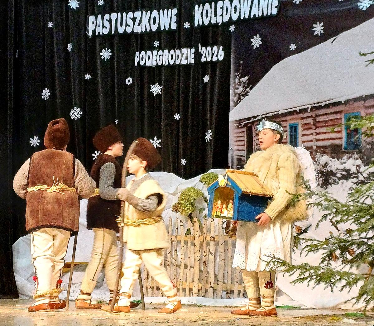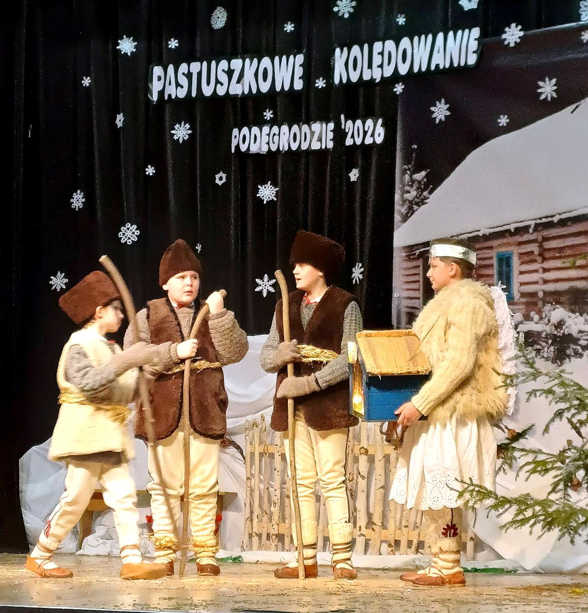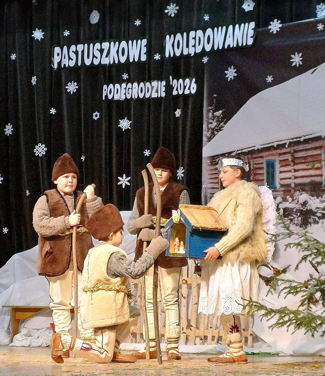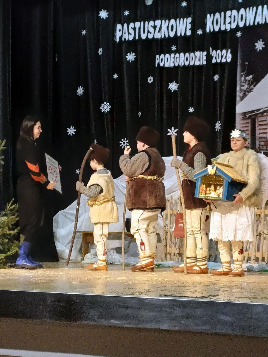 Nasza reprezentacja - Hubert, Wiktor, Tomek i Michał - na scenie Gminnego Ośrodka Kultury w Podegrodziu - na 29. Ogólnopolskich Spotkaniach Dziecięcych i Młodzieżowych Grup Kolędniczych PASTUSZKOWE KOLĘDOWANIE !!! Brawo chłopaki - jesteśmy z Was dumni. Grupa kolędnicza Mali Grojcowianie prezentująca OBCHODZENIE PASTUSZKÓW Z ANIOŁEM zajęła III MIEJSCE podczas 29. Ogólnopolskich Spotkań Dziecięcych i Młodzieżowych Grup Kolędniczych PASTUSZKOWE KOLĘDOWANIE