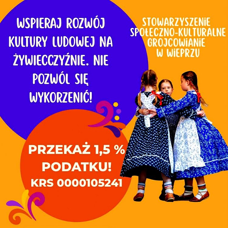 Zbliża się czas rocznych rozliczeń finansowych. PRZEKAŻ swój 1,5% podatku na rzecz OPP - Organizacji Pożytku Publicznego. Wspieraj rozwój kultury ludowej Żywiecczyzny !!! Nie pozwól się wykorzenić !!! Wesprzyj OPP - Stowarzyszenie Społeczno-Kulturalne "GROJCOWIANIE" w Wieprzu - KRS 0000105241. Namów do tego swoich znajomych !!